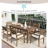 DescriptionExperience outdoor dining like never before with the Acacia Wood Outdoor Dining Table and Chairs set. Perfect for entertaining family and friends in your backyard or patio; this set offers a comfortable and stylish dining experience for up to 6 people. The premium acacia wood construction makes this set waterproof; rust-proof; and UV-proof to protect it from the elements and keep it looking great for years to come.Highlights [ELEGANT DESIGN] The table set features a modern and stylish design that adds class and beauty to your patio; balcony or garden.[Excellent Quality] Each seat can support up to 352 pounds; while the desktop can bear a weight of 352 pounds; making it durable and stable for all your outdoor gatherings.[Wide Range Of Applications]Made of waterproof; rust-proof and UV-proof Acacia wood; this dining set is a great addition to your patio; balcony or backyard. [Easy Assembly]The set comes with easy-to-follow instructions and necessary hardware for quick assembly; so you can start enjoying your outdoor dining experience in no time!Weights & Dimensions