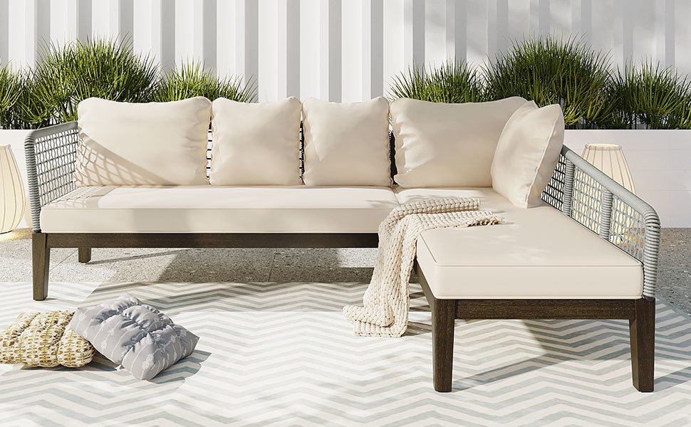 Versatile⪻acticalThis outdoor sofa set is thoughtfully designed for both comfort and convenience. Each pillow and cushion features a removable cover, making them easy to detach for recommended hand washing. Additionally, each leg is fitted with a non-slip pad to protect floors and minimize wear.Highlights∑maryHighlightsSectional Sofa Set // Regatta Rope // Polyester&Foam Cushion // Acacia Wood Frame // Detachable Cushion // L-Shaped Sofa Set // Hand-Tied Ropes // Water-Resistant // 2 Colors AvailableSummaryUnveil the charm of our 2-piece sectional sofa set, tailored for the great outdoors and spacious enough for 5 people to share the fun. With its robust Acacia wood frame and stylish, hand-tied Regatta ropes, durability meets elegance for this L-shaped ensemble. Our detachable polyester and foam cushions offer a cloud-like seat that's a breeze to clean.Ready to laugh and lounge? Your patio's social scene just got a stylish upgrade!