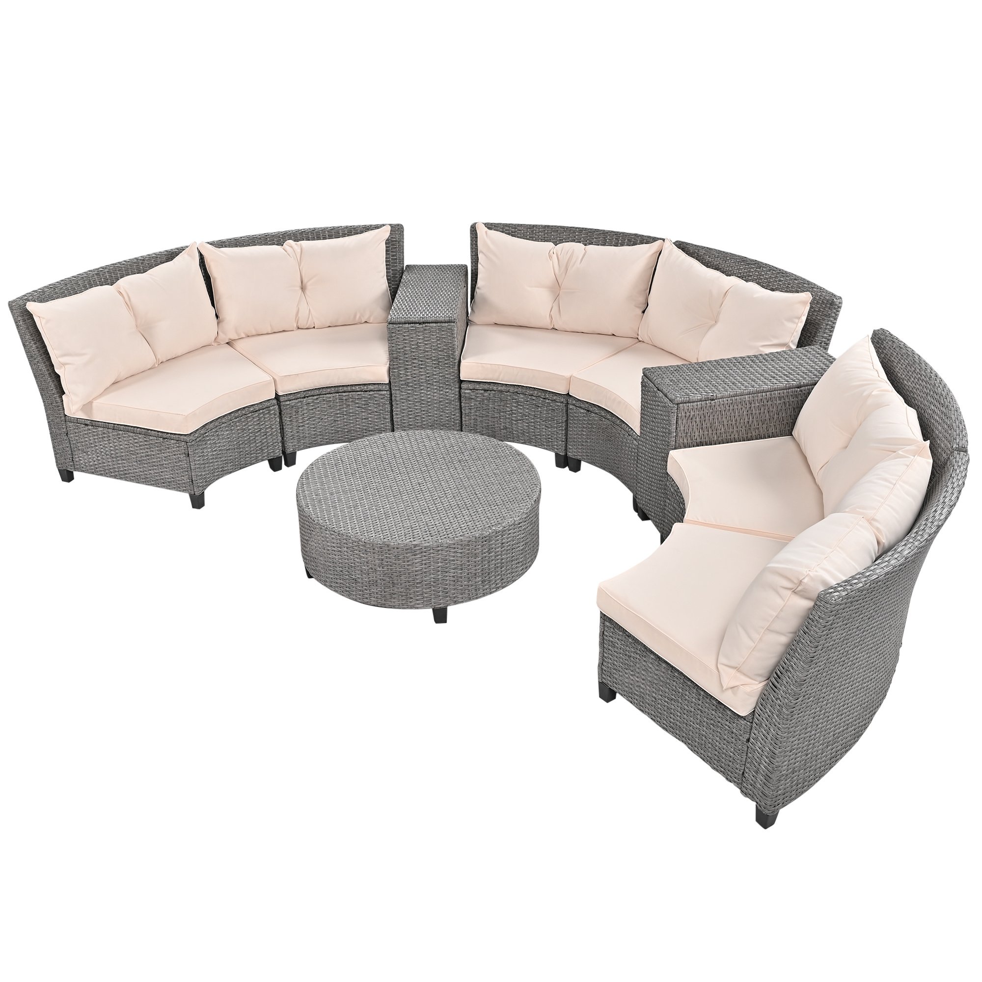 [VIDEO provided] 6 - Person Fan-shaped Rattan Suit Combination with Cushions and Table; Suitable for Garden